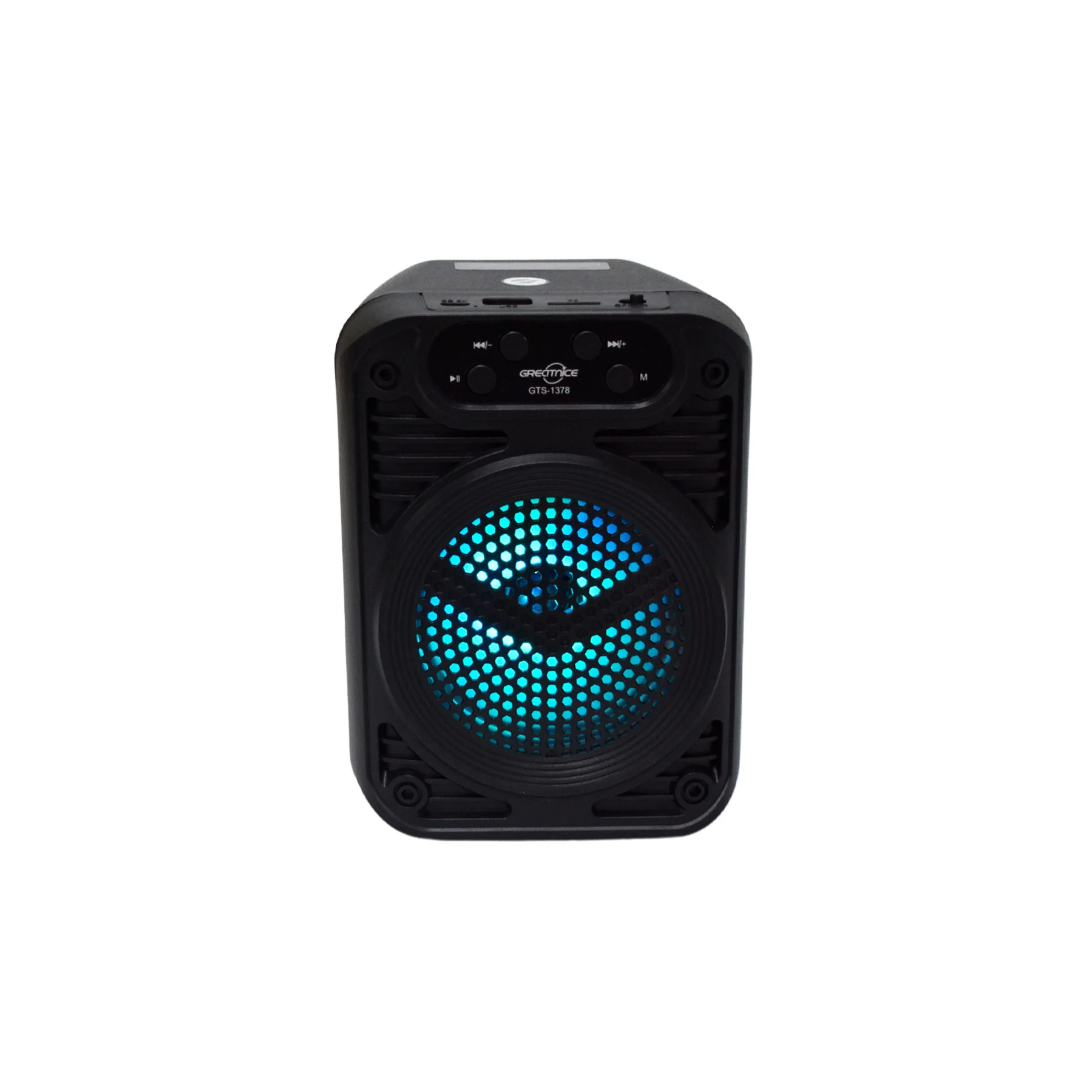 ?Alto-falante Bluetooth de 4" com painel solar e luz LED. Entradas USB e micro SD na parte superior do alto-falante. É facilmente carregado através do cabo V8 que acompanha o alto-falante. As luzes da buzina LED mudam de cor, o design da buzina inclui painel solar. Radio FM. Na frente estão os botões para reproduzir sua música, reproduzir e pausar, retroceder e avançar sua música.