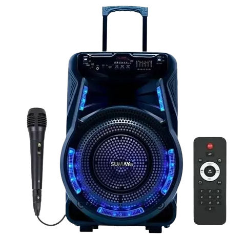 Caixa de som Style 12 sm-cap24 Sumay A Caixa de Som Amplificada Sumay STYLE 12 800BT 400w 110V/220V agrega estilo e beleza ao ambiente. Equipada com Leds azuis em torno do falante e tweeter, o equipamento vai, com certeza, ajudar você a chamar a atenção e animar a sua festa. Com 400w RMS de muita potência, a Style 12 se destaca pelos excelentes GRAVES proporcionados pelo seu alto falante de 12 polegadas, sendo perfeita para músicas como Funk e HIP-HOP que exigem muitos dos graves da caixa. Caso você não queira graves ao extremo, a caixa possui um equalizador de 05 bandas para você deixar o som mais FLAT (equilibrado) caso desejar. Se a sua intenção é utilizar sua caixa para palestras ou para evangelização, ela é a opção perfeita, pois acompanha microfone com fio, ajuste e ECHO. Além disso, o equipamento é bem leve e pode ser levada a qualquer lugar, além de garantir cinco horas de autonomia de bateria. Ouça sua playlist através da entrada auxiliar, cartão de memória, Bluetooth ou conexão USB. Ela também possui entrada P10 (microfone), conexão TWS e rádio FM. Especificações técnicas RMS - 400w; Alto Falante; 1 Woofer de 12 polegadas cada; Equalizador de 05 bandas; Ajuste de ECHO; Luz em LED nos Falantes; Alça retrátil para transporte e rodinhas; Função Bluetooth 5.0; Bivolt (110/220v); Bateria de 05 horas de duração média; Função TWS; Função Troca de pasta; Frequência: 40 ? 20KHz; Controle Remoto; Radio FM; Medidas - 36cm Largura x 30cm Profundidade x 55cm Altura; Peso - 7,0kg; Leitura de arquivos por pasta - Sim; Função gravar (REC) - Sim; Formatos de áudio - MP3; Microfone prioridade - Sim; 1 Entrada Auxiliar (P2); 1 Entrada microfone ou Guitarra (P10); 1 Entrada USB (Reprodução MP3); 1 Entrada Cartão SD (Reprodução MP3). Itens Inclusos 1 Caixa de Som; 1 Microfone com fio; 1 Controle Remoto; 1 Carregador; Manual do usuário